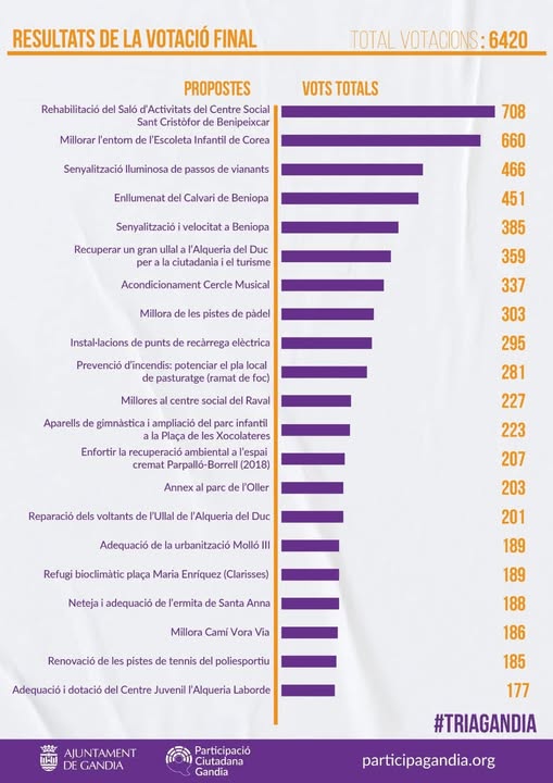 🙌 6.420 vots registrats! La ciutadania ha decidit quins projectes ajudaran a millorar Gandia! 🏡🚀